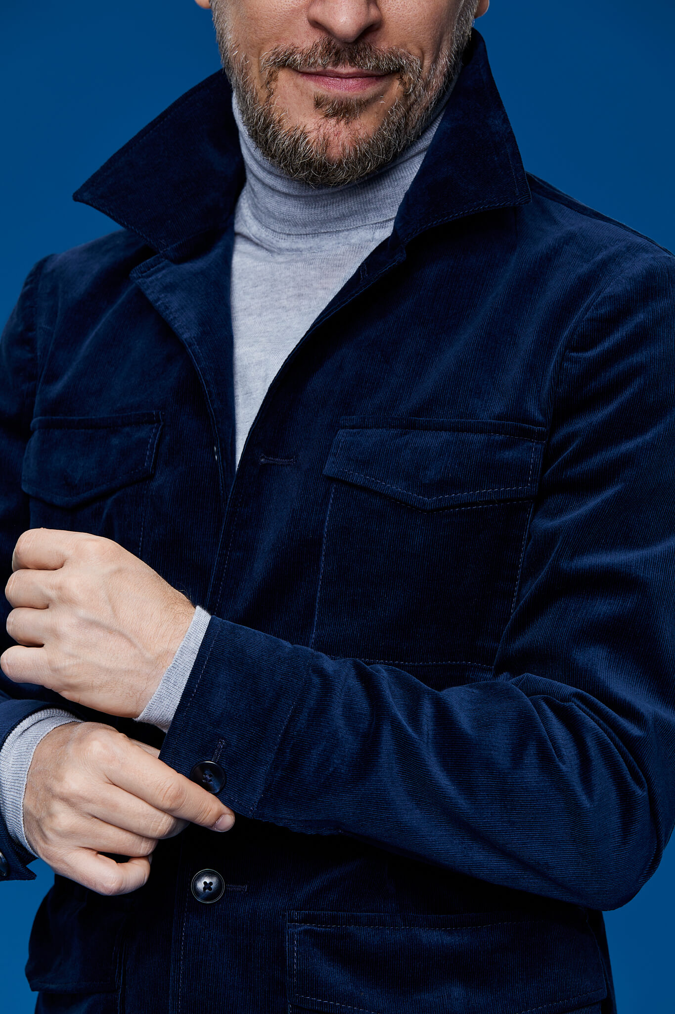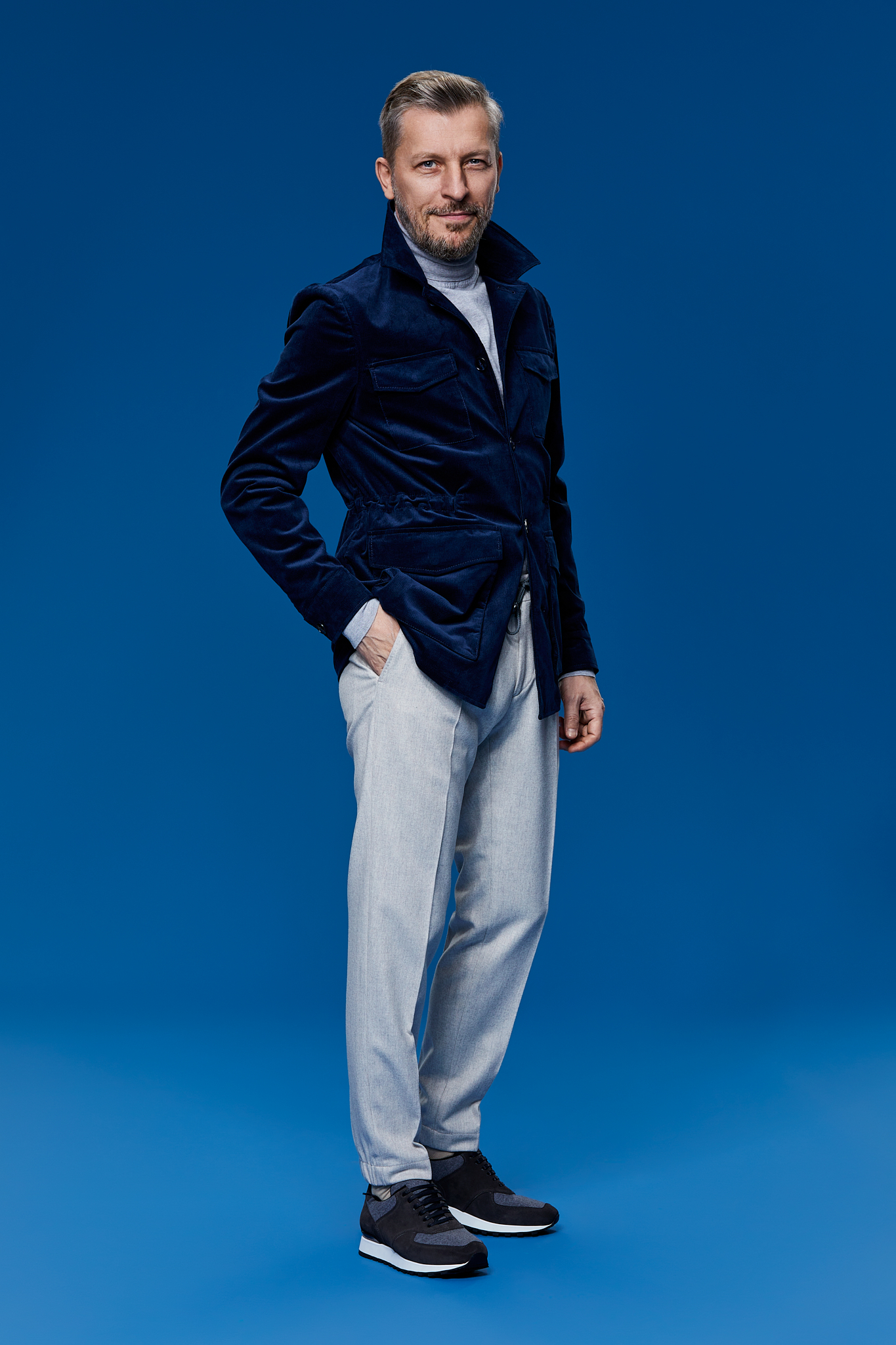 A fresh approach to classic tailoring - the velor safari jacket brings a touch of nobility through the velvety shine of the fabric, on a utilitarian, practical and versatile construction.