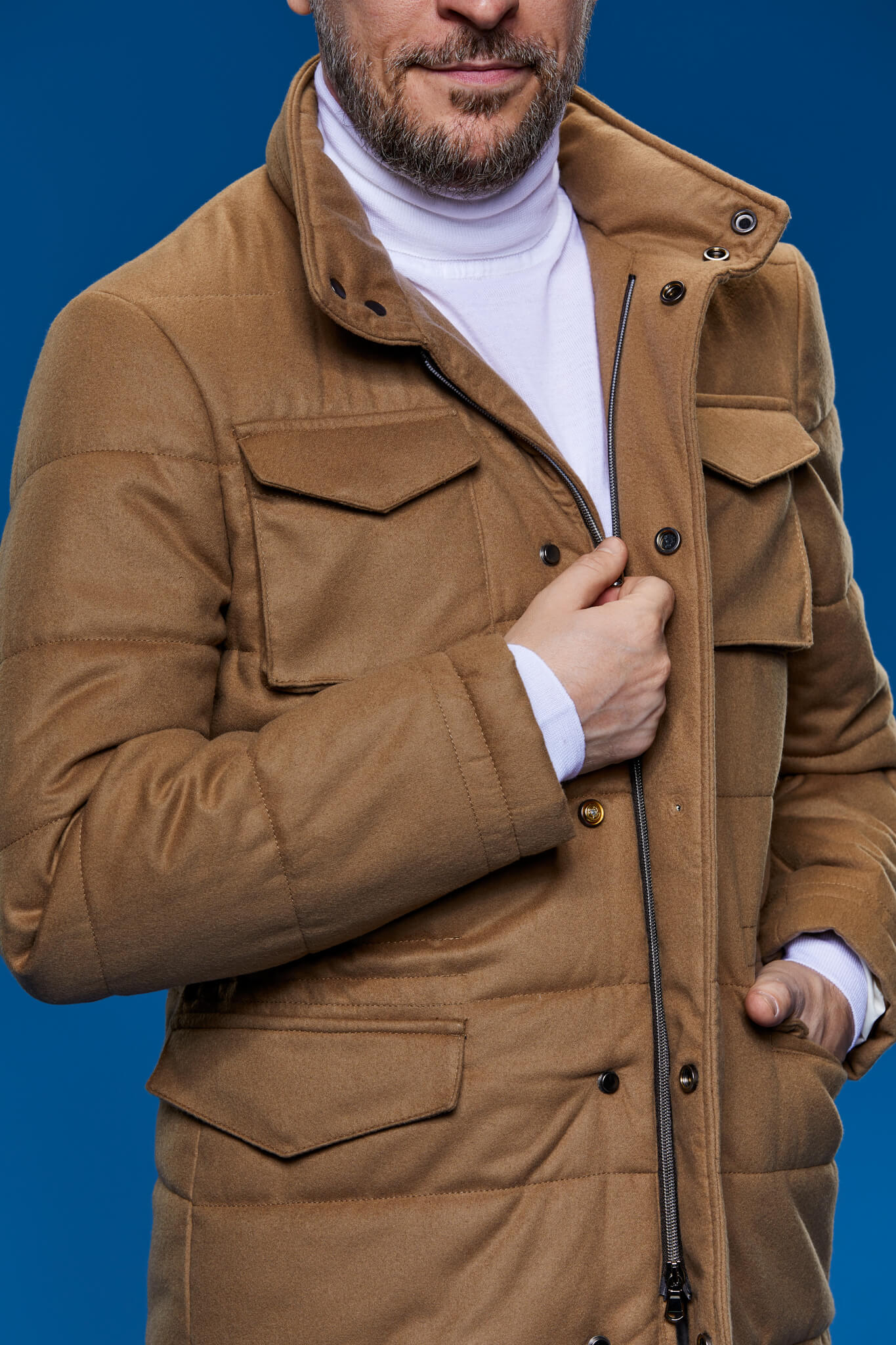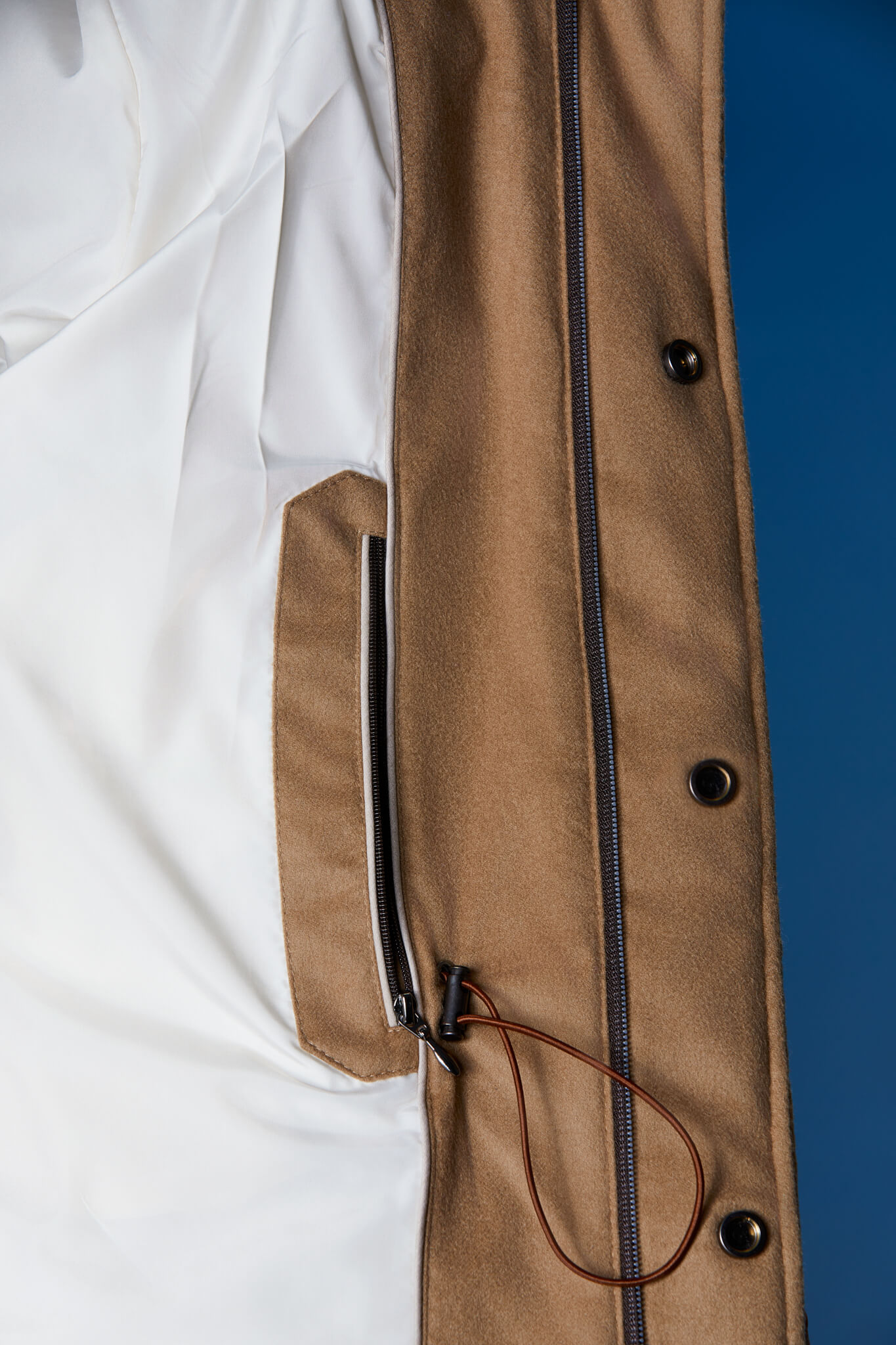 A warm and practical coat, as precious as it is. With a utilitarian construction, enriched by the exceptional touche of cashmere
