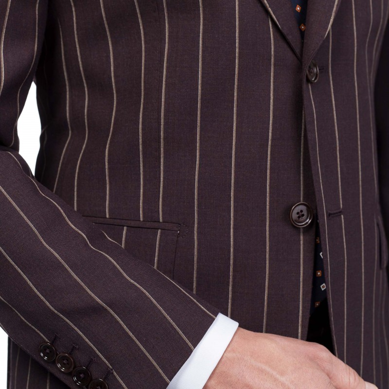 The Mavson suit is a suit for all seasons. Made of a purple striped beige fabric from the Eco-Traveler® collection from Holland & Sherry, this suit does not wrinkle, and can be crumpled in luggage and then worn as if it had been freshly ironed.