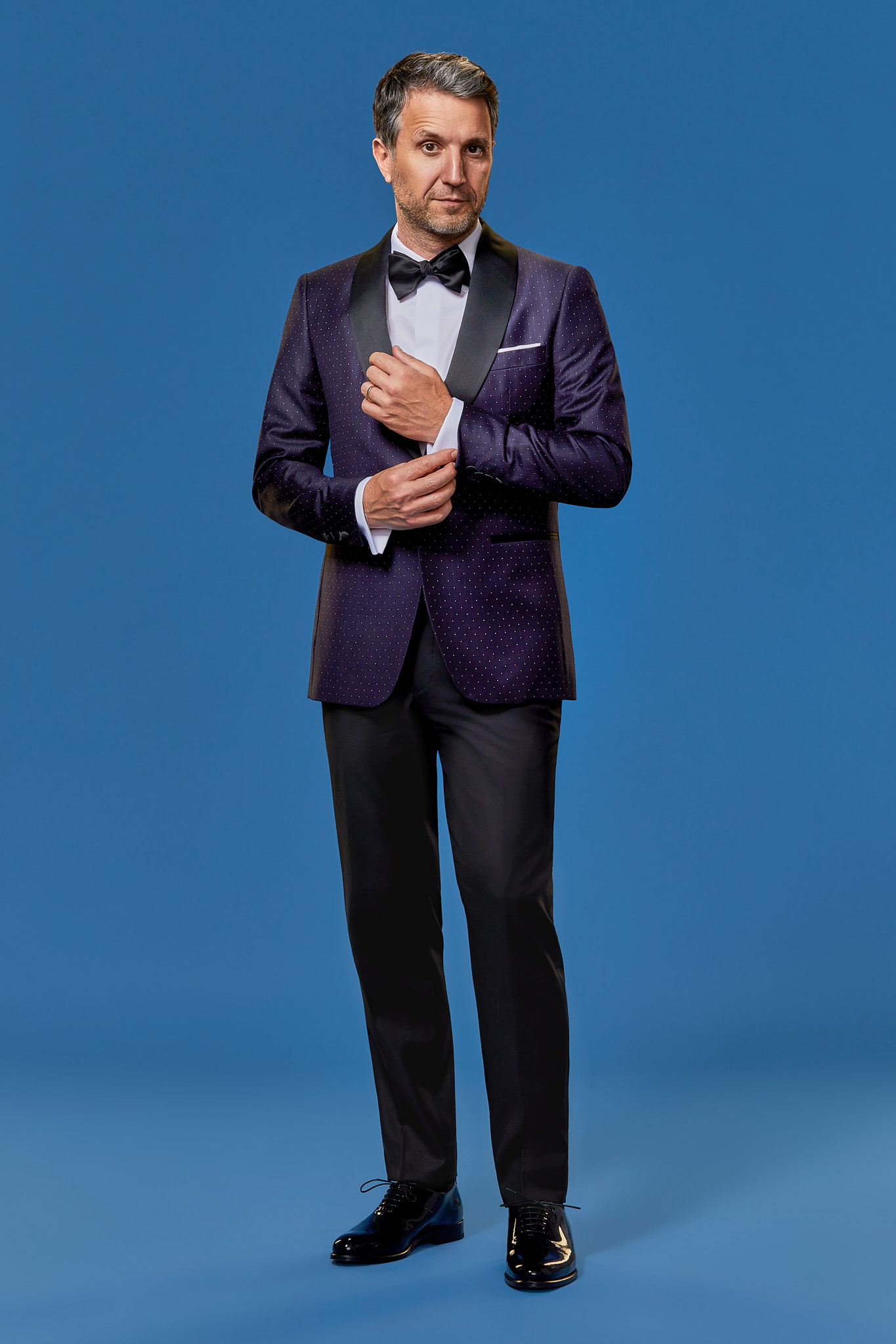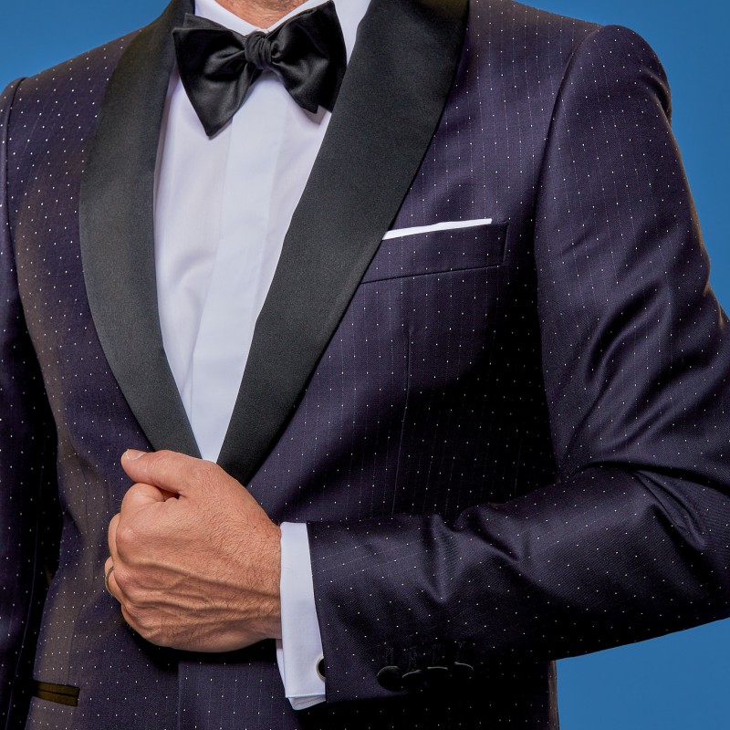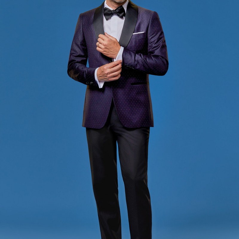 The CARDINAL evening outfit is for men who dare to choose a shade with personality and has as main piece an evening jacket made of a navy blue fabric with discreet dots. If black is the first option and must be kept in pants, here the desire to subtly come out of anonymity speaks for itself through a discreet impression of color at the top.