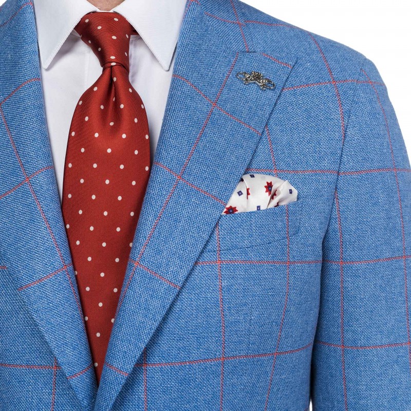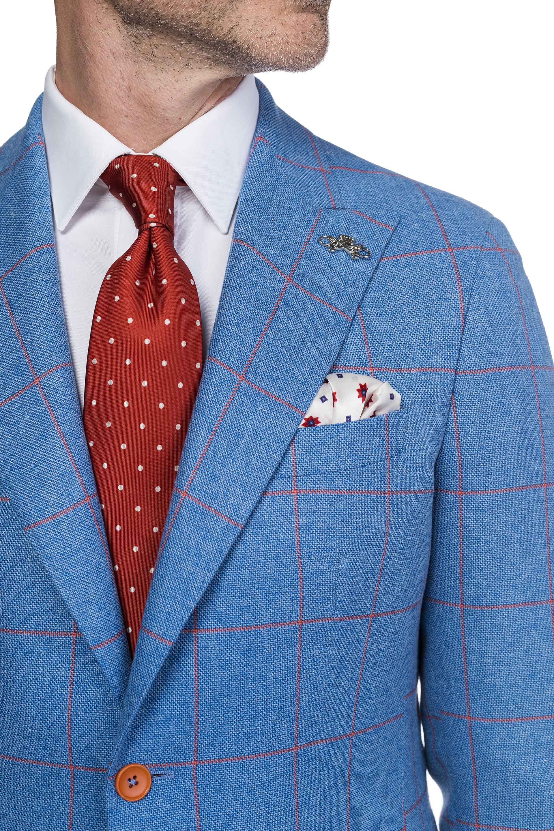 The main outfit of the Caribbean outfit is a plaid jacket suitable for the spring-summer season. The fabric of the jacket is very light and breathable due to the combination of linen, silk and wool. The orange pants compliment the grid of the jacket.