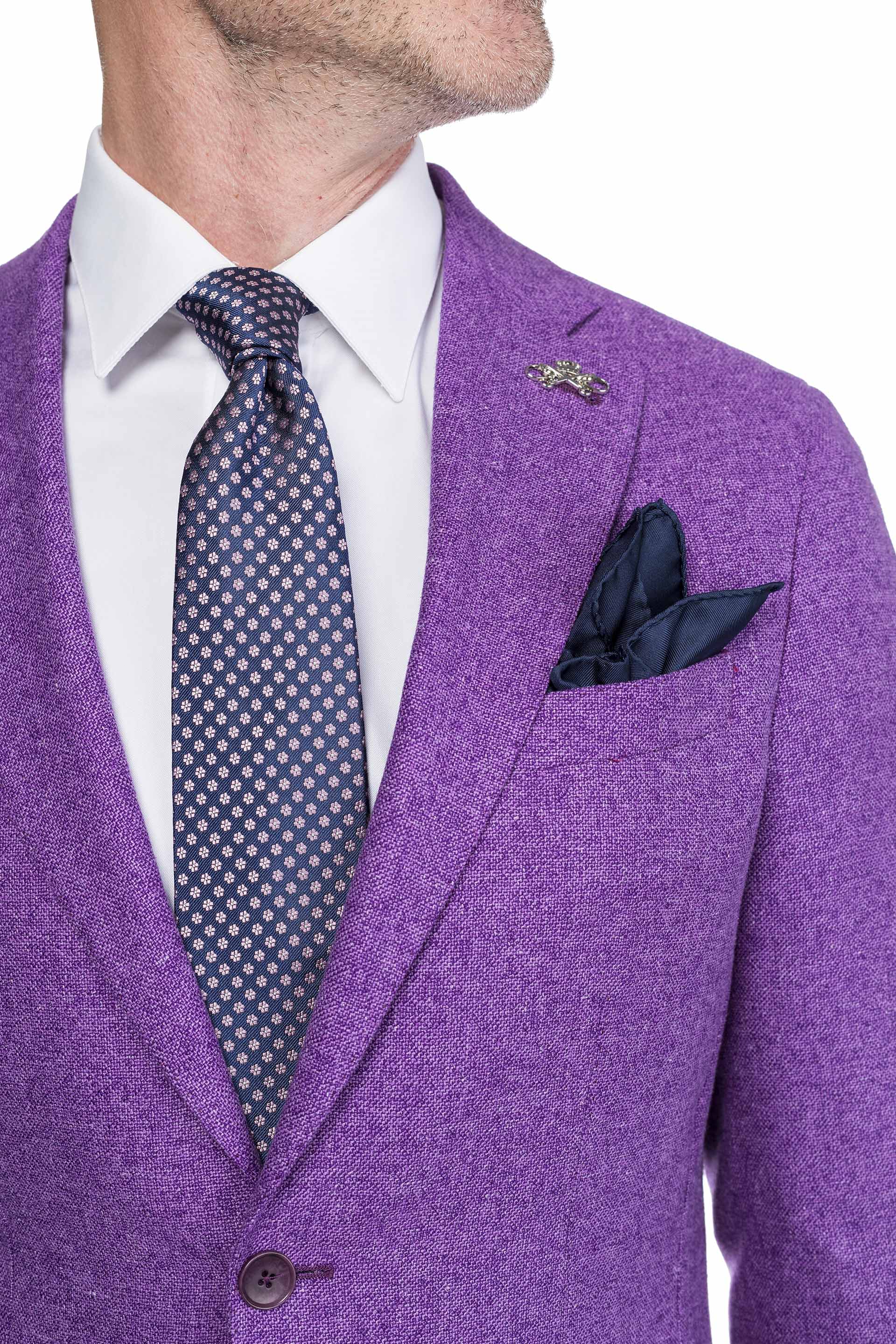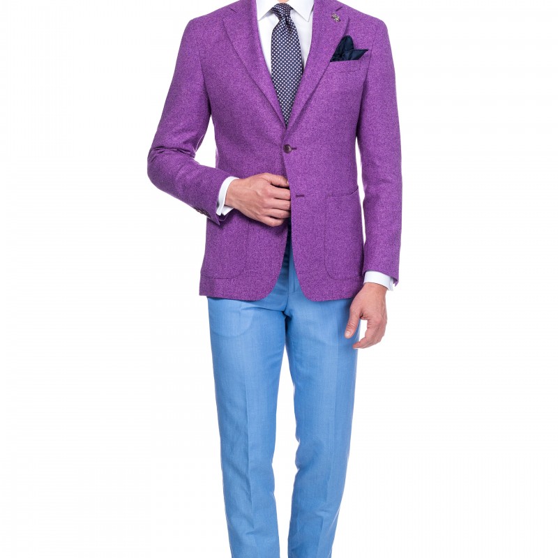 The main part of the Salton outfit is a purple jacket suitable for the spring-summer season. The range of colors is a choice worthy of a stylish gentleman who wants to match in his wardrobe bright colors like that of the jacket. The contrast that the jacket offers with the celestial of the pants balances the outfit and makes it perfect.