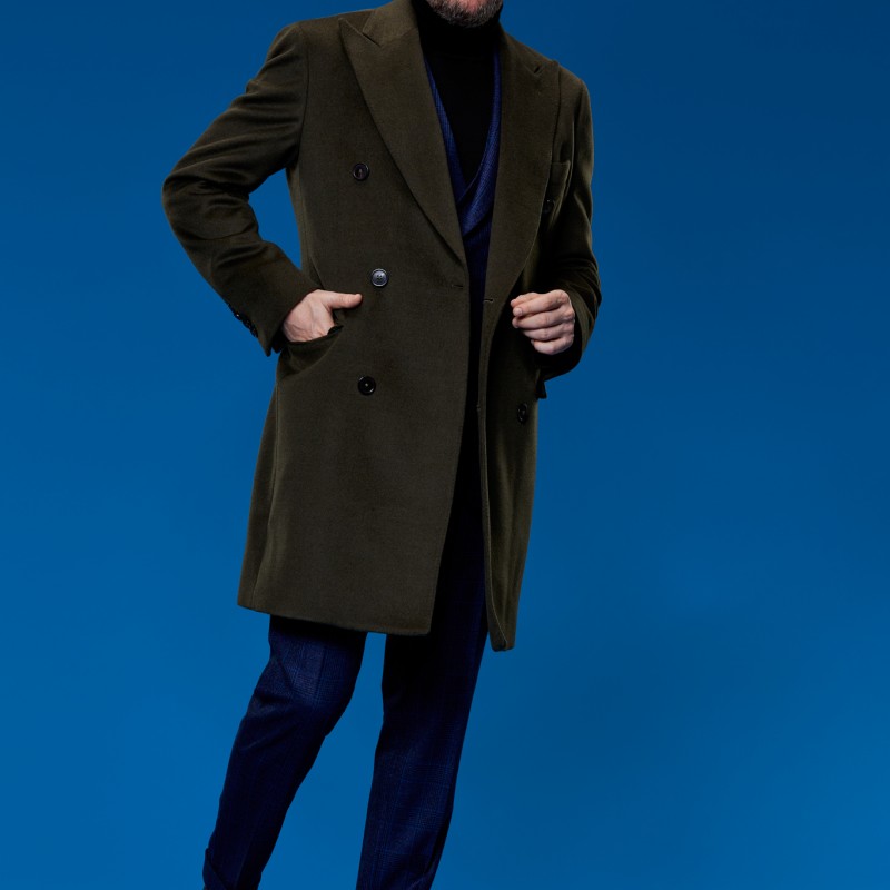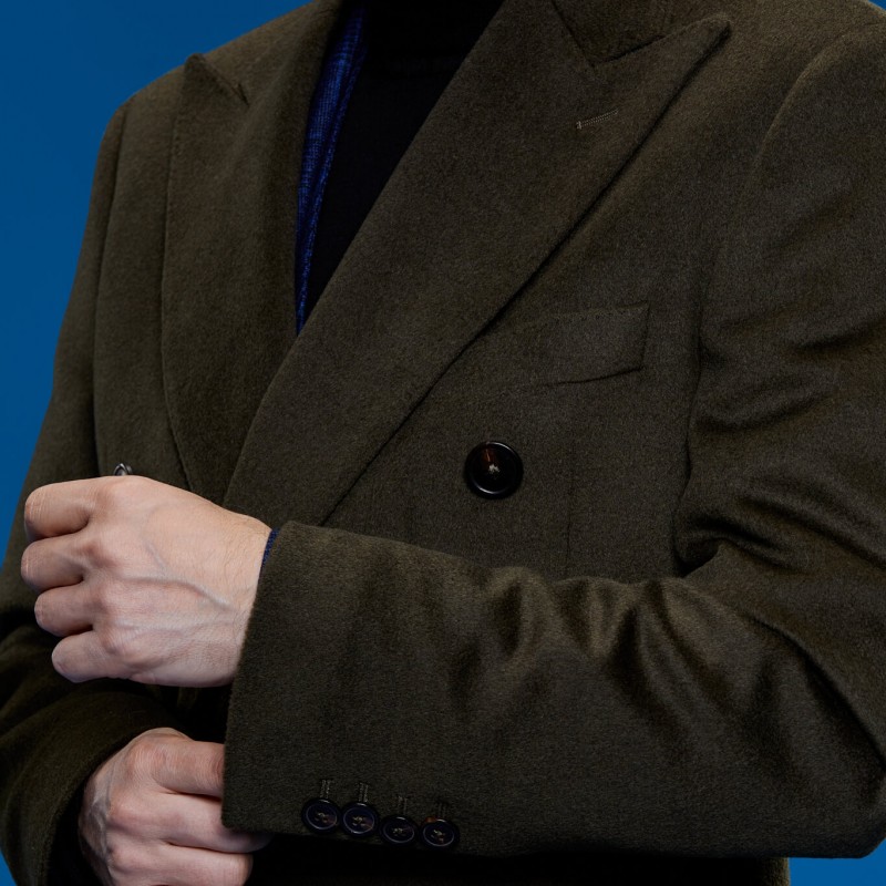 Palton din stofă plină și moale, la două rânduri de nasturi, în nuanță discretă de pământ.